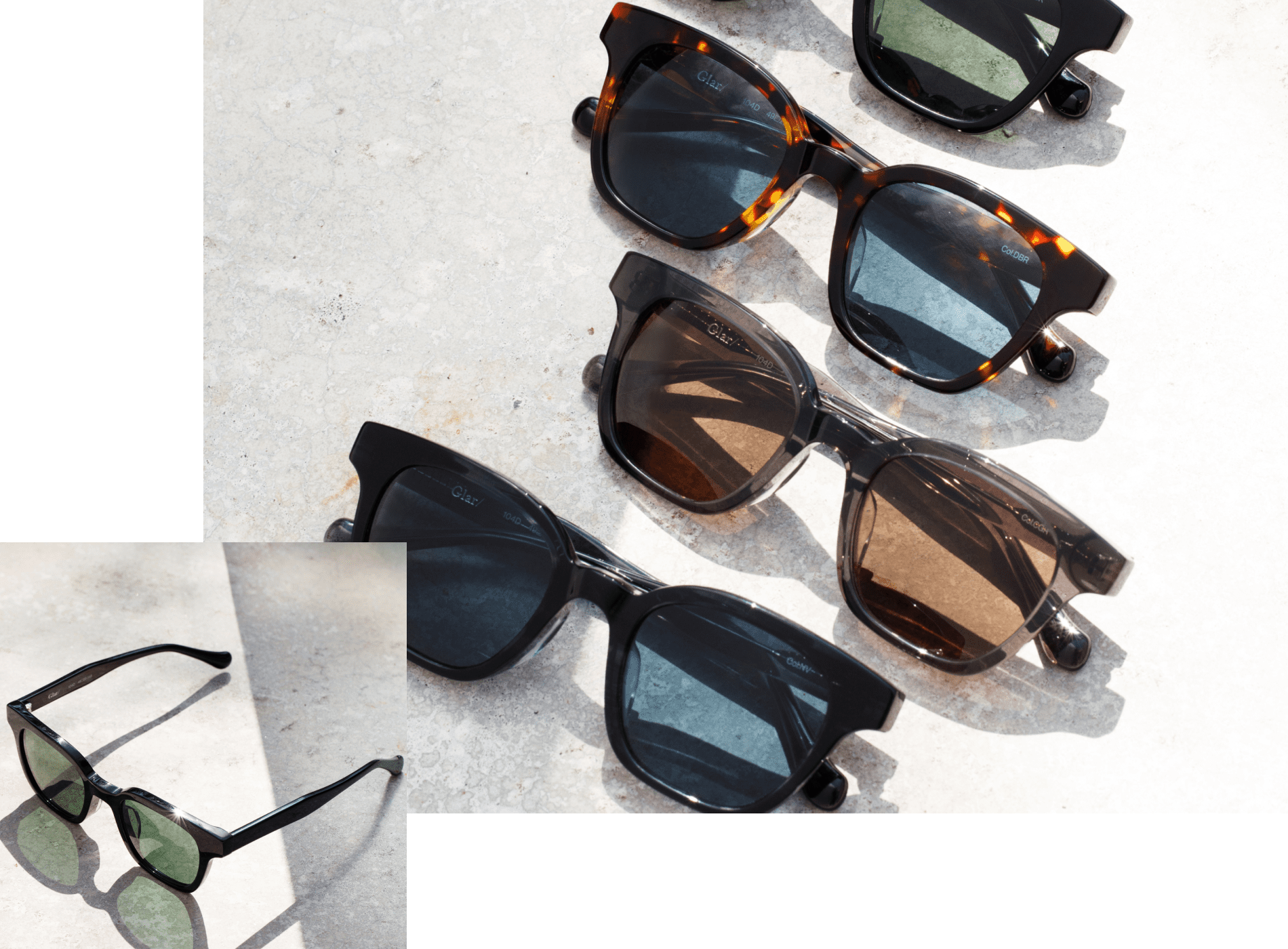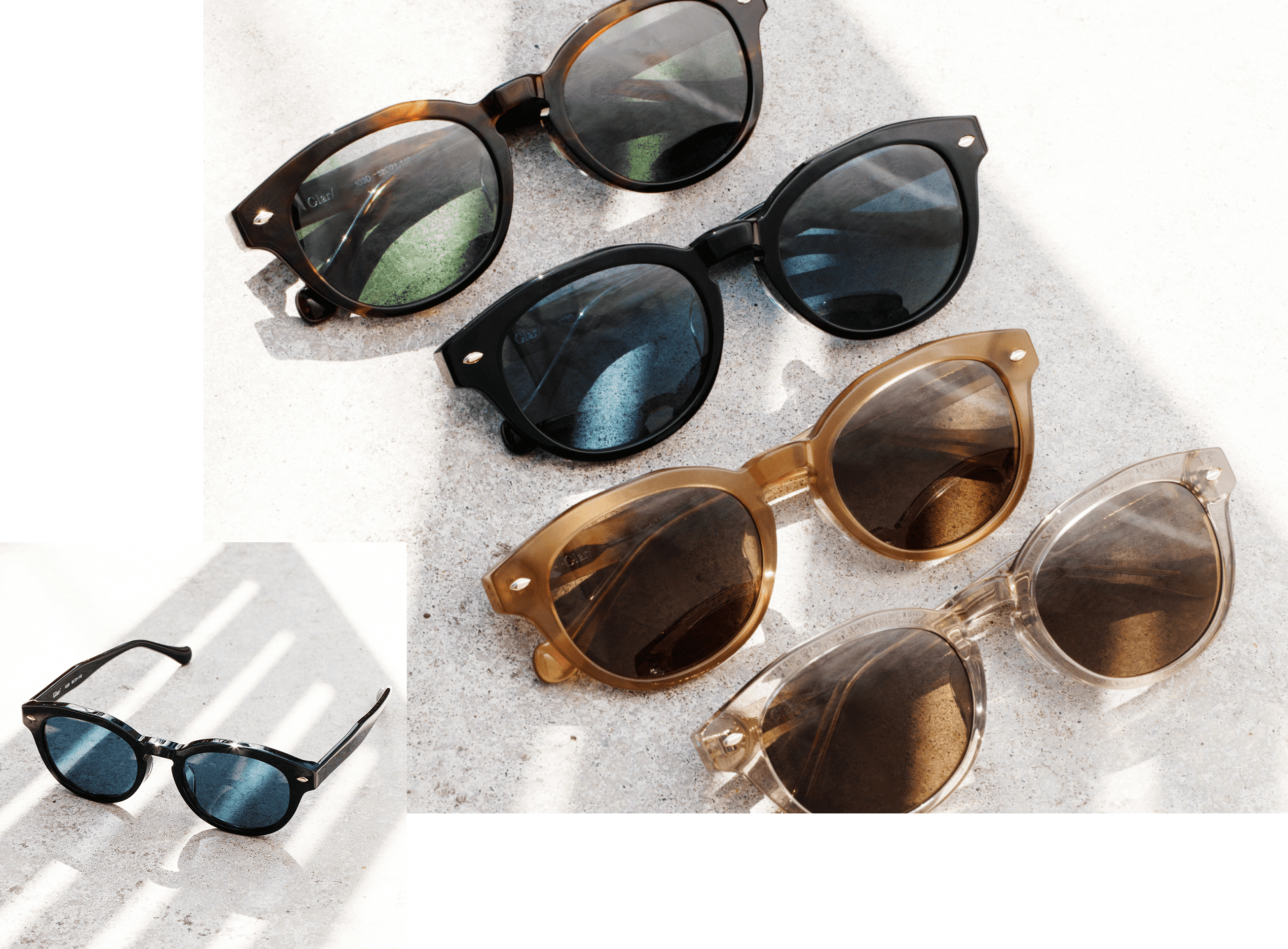 日差しをしっかりガードする大ぶりなモデルに、ダークカラーレンズを採用。シンプルなデザインながらフレームの素材本来の質感により、重厚感を演出。
