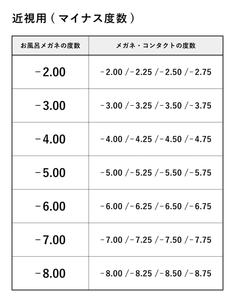 調べた度数と下の度数対応一覧表を照らし合わせて、お風呂メガネの度数をお選びいただけます。