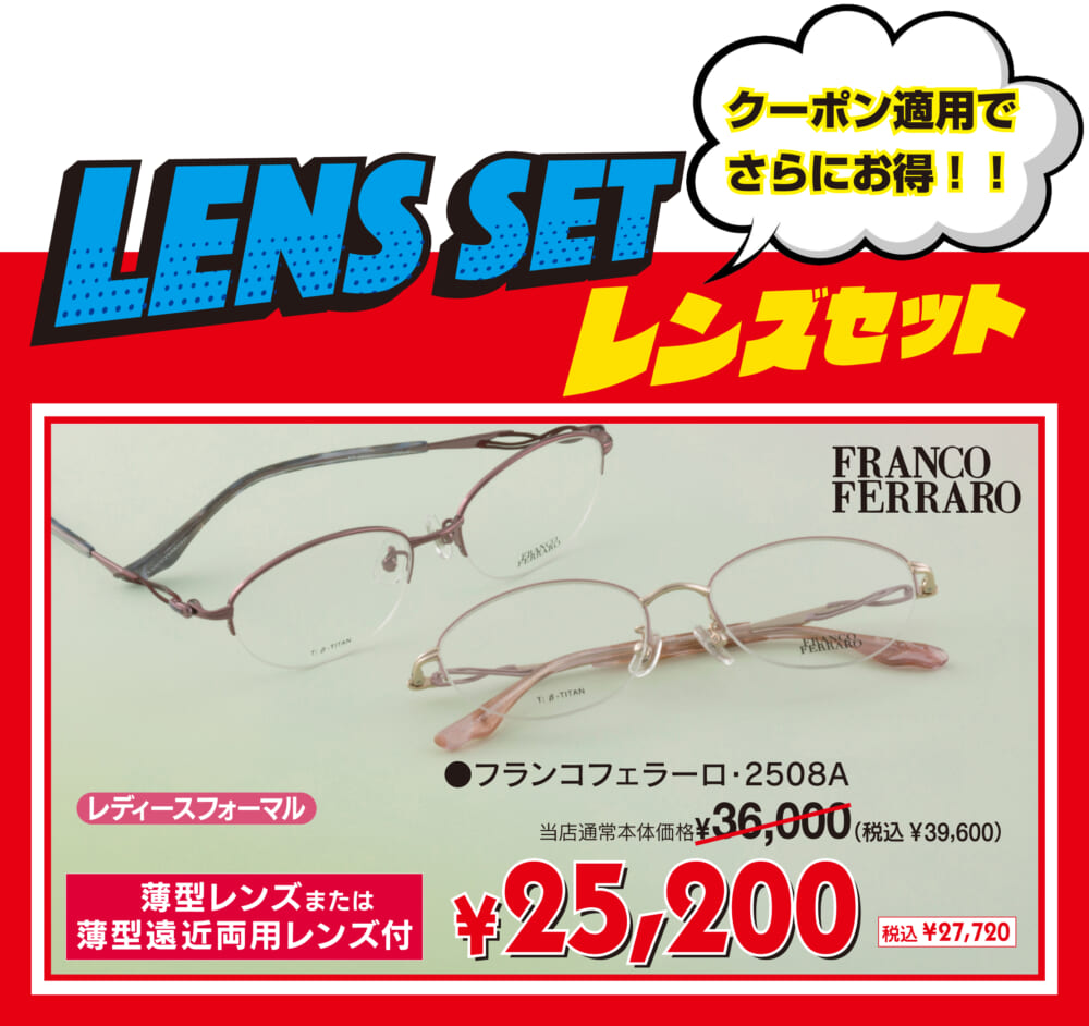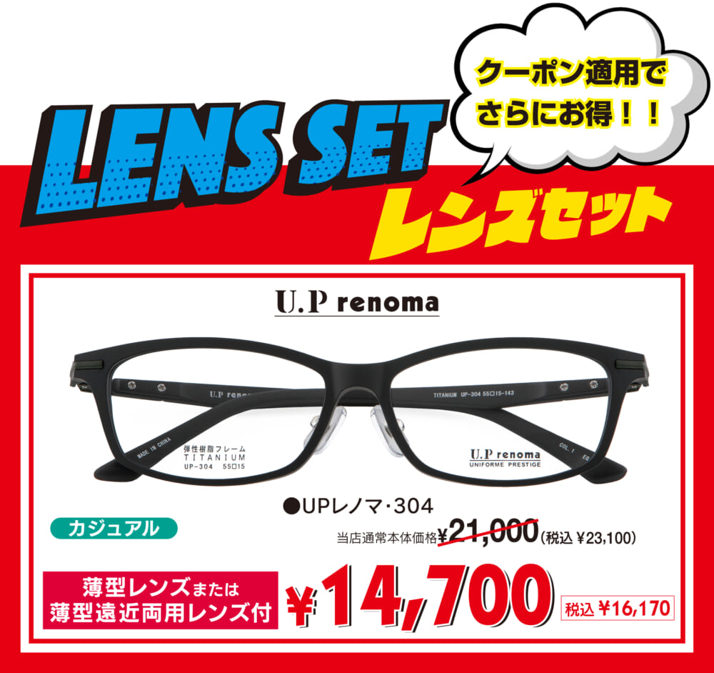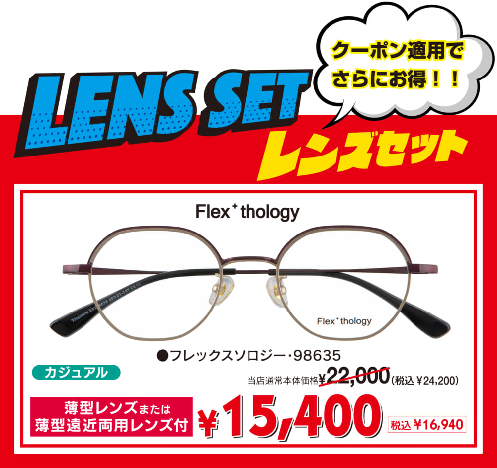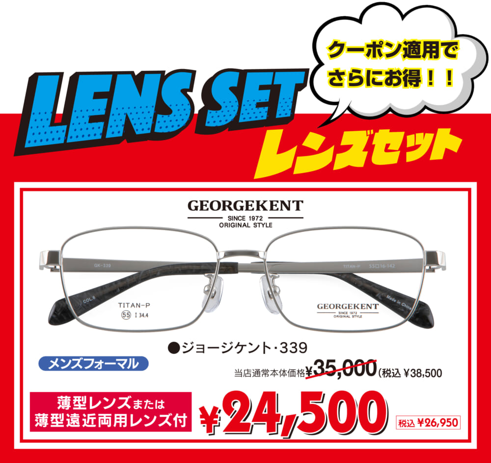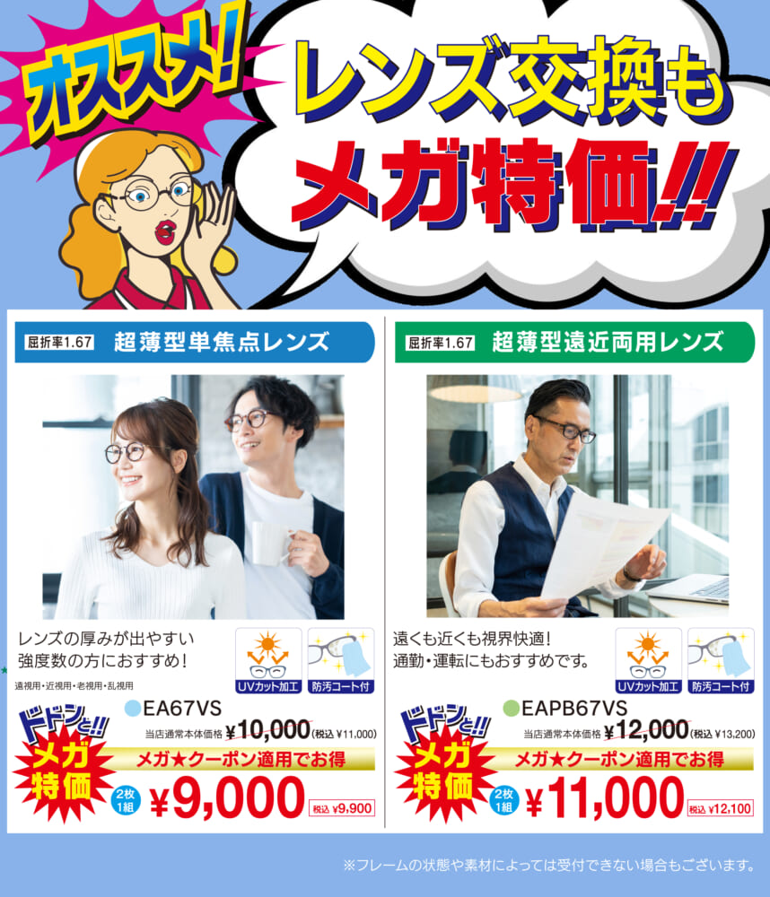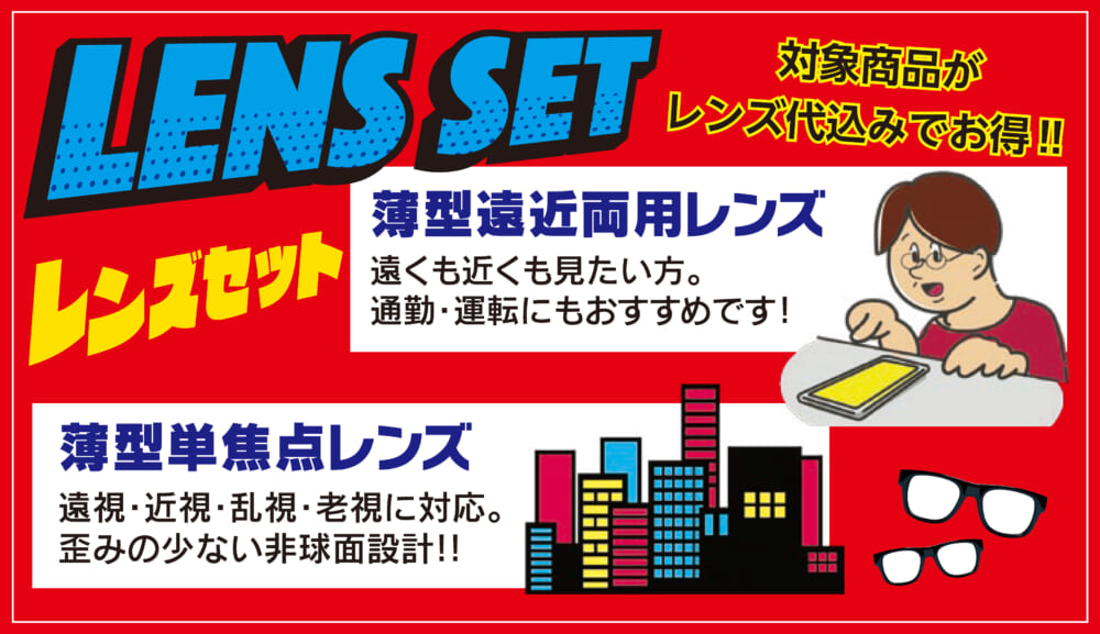 メガネ一式価格が最大30%OFF!対象商品は薄型レンズ・薄型遠近両用レンズ付きの一式価格です!ぜひお見逃しなく!