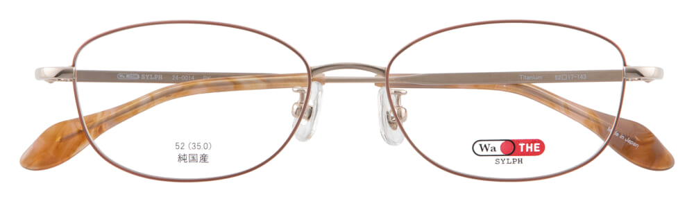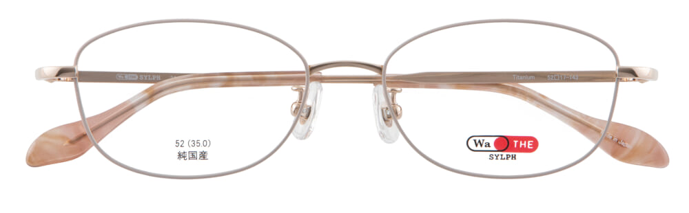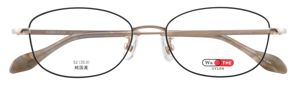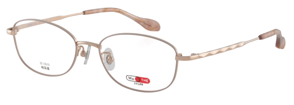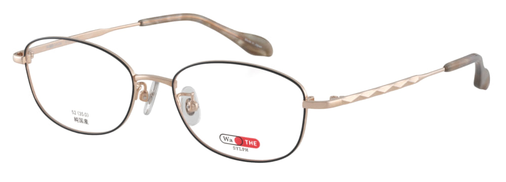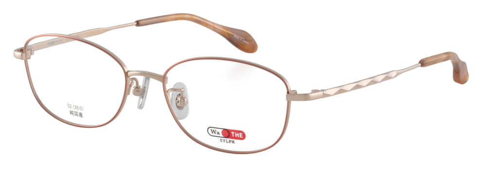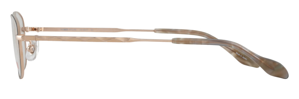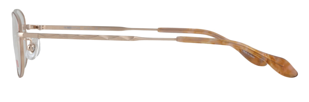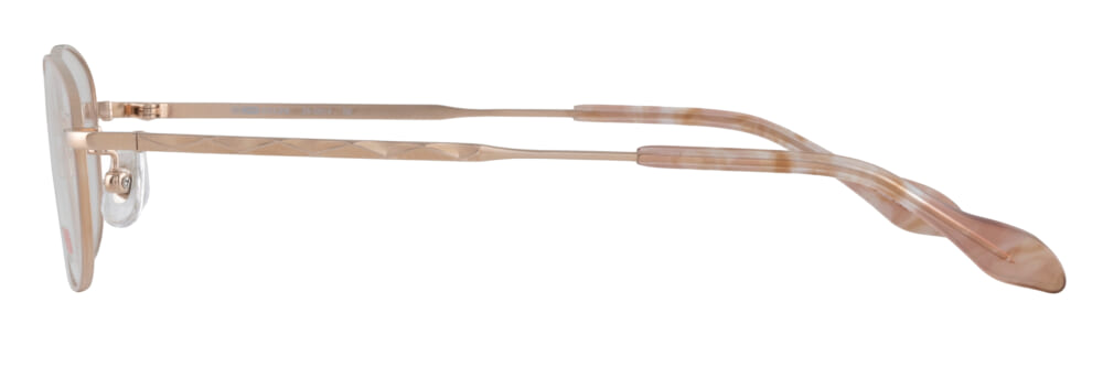 品番「24-0014」はジュエリーを思わせる飾り模様のテンプルが特徴的。フレーム全体は肌を明るく見せてくれるゴールドを合わせて、パッと華やかに仕上げました。